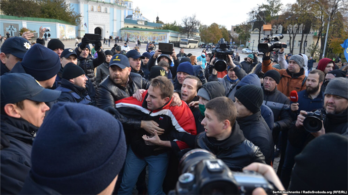 Вместе с тем, пресс-служба ВО "Свобода" сообщила, что в субботу на Михайловской площади полиция, "применив силу, задержала и затолкала в автозак" голову Дарницкой районной организации ВО "Свобода" Владимира Бохняка и его помощника свободовца Олеся Олийныка.