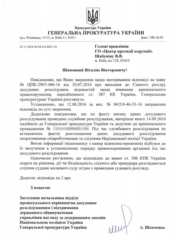 "По факту утечки данных предварительного расследования проведено служебное расследование, материалы которого 14 сентября 2016 поступили в Генпрокуратуру и приобщены к уголовному производству. Во время служебного расследования не установлены факты разглашения данных предварительного расследования оперативными сотрудниками и следователями Нацполиции", - отмечается в ответе.