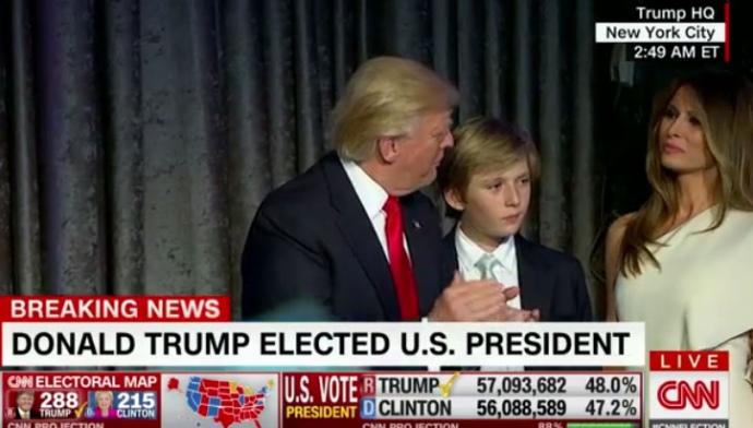 Его речь началась после того, как стало ясно, что он побеждает, а его оппонент Хиллари Клинтон позвонила ему и признала его победу.