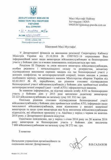 В департаменте МОУ также отметили, что не располагают информацией о численности военнослужащих, которым было отказано в выплате указанного вознаграждения и о сумме вознаграждения, которое было выплачено военнослужащим подразделений, оборонявших промзону в Авдеевке в период с июня по октябрь 2016 года.