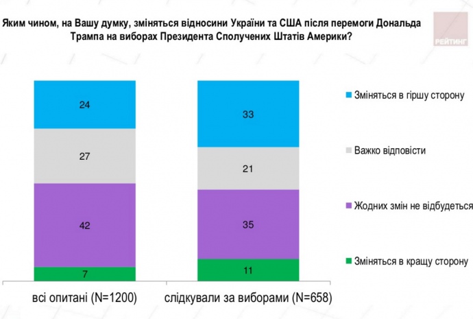 Четверть украинцев думают, что отношения между США и Украиной ухудшатся после победы на выборах Дональда Трампа.