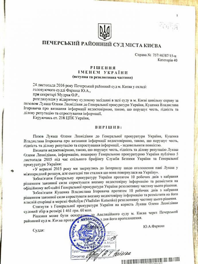 "Только что Печерским районным судом города Киева удовлетворен мой иск к Генеральной прокуратуре о признании недостоверной информации, распространенной ГПУ на брифинге после моего "блестящего" задержания на кухне", - сообщила Лукаш, обнародовав копию судебного решения от 24 ноября.