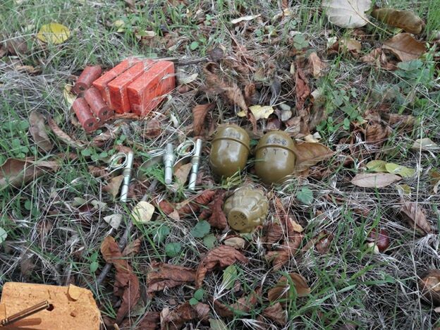"Правоохранители изъяли из схронов противотанковый гранатомет РПГ-22, два выстрела к гранатомету РПГ-7, три гранаты РГД-5 и Ф-1, шесть тротиловых шашек общим весом 825 граммов и один брикет пластида весом 600 граммов", - говорится в сообщении.