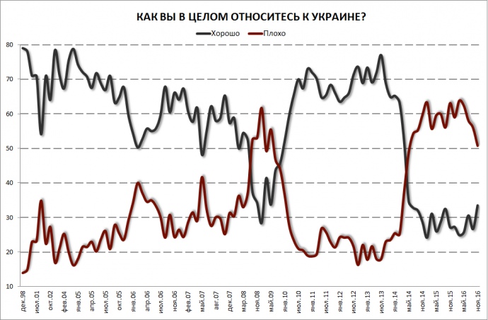 Кроме того с начала 2016 года на 4% выросло число жителей РФ, которые хорошо относятся к Украине, до 33 процентов (3% россиян относятся к украинцам "очень хорошо").