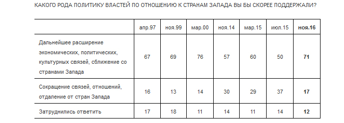 Таким образом, стало меньше тех, кто высказывается за отдаление от Запада (17% в 2016 году сравнительно с 37% в 2015-м).