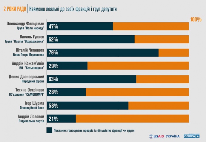 В рейтинге депутатов, которые голосуют в разрез с позицией фракции, особенно выделился представитель БПП Виталий Чепинога (79% голосований), Денис Дзензерский от "НФ" (63%), Василий Гуляев от "Видродження" (62%), Игорь Шурма от "ОБ" (58%) и другие.