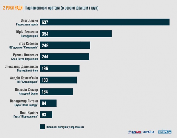 Главным оратором Рады с сильным отрывом от остальных оказался Олег Ляшко (Радикальная партия, 637 выступлений), Юрий Левченко (внефракционный, 354), Егор Соболев ("Самопомич", 249), Руслан Князевич (БПП, 244), Александр Долженков ("ОБ", 196) и другие.