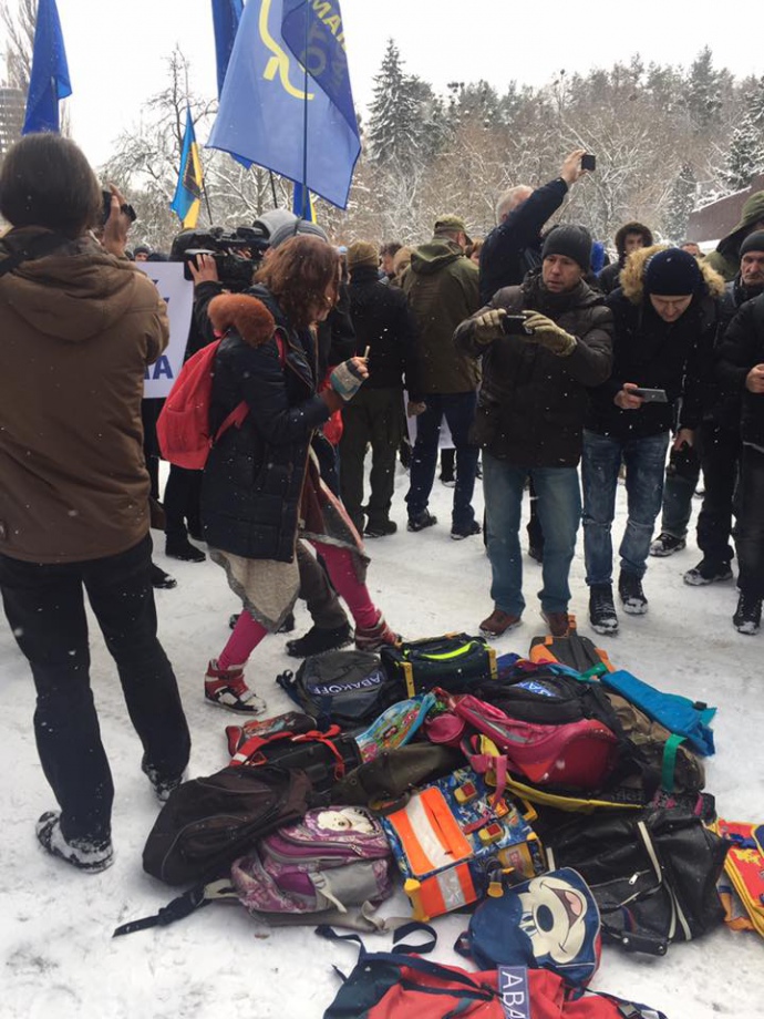 На заборе особняка активисты развесили плакаты "Авакова в отставку", "С рюкзаком на выход", привезли с собой рюкзаки, а во время акции скандировали "Авакова на нары!" и "Позор!".