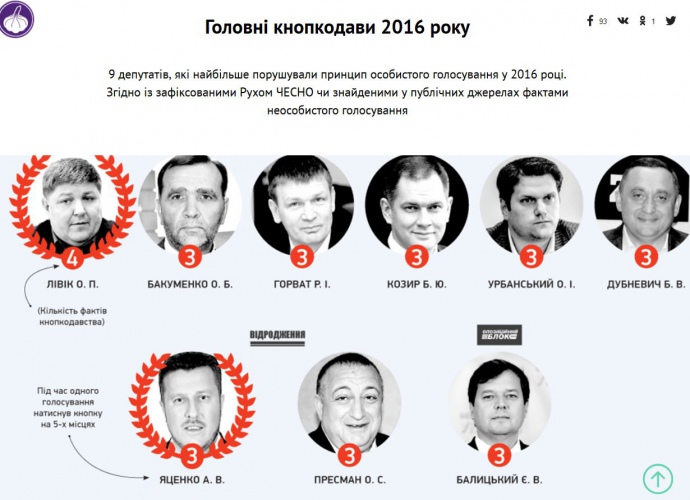 Кроме того, за 2016 год без 10 дней движение "Честно" зафиксировало 68 фактов кнопкодавства, что на 3 случая меньше, чем в 2015 году (71 факт). Лидер в этом нарушение – президентская фракция.