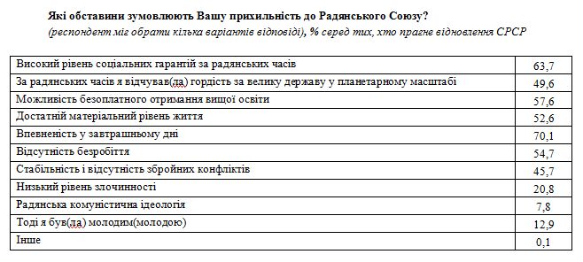 Те, кто хочет восстановления Советского Союза, чаще всего обосновывают это тем, что во времена СССР были уверенность в завтрашнем дне (70%), высокий уровень соцгарантий (64%), бесплатное высшее образование (58%), не было безработицы (55%), материальный уровень жизни ощущался достаточным (53%), люди чувствовали гордость за великое государство (50%), людей радовала стабильность и отсутствие вооруженных конфликтов (46%).