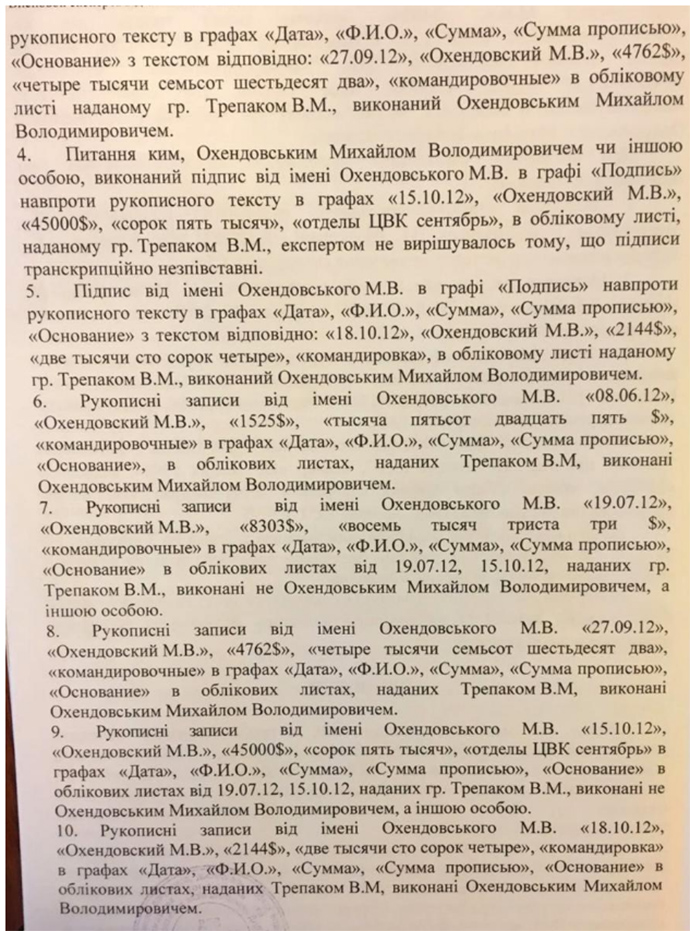 В сообщении отмечается, что заключение экспертизы Киевского научно-исследовательского института судебных экспертиз (КНИИСЭ) Министерства юстиции Украины, которая вместо положенных 10 дней по неизвестным причинам длилась 3,5 месяца, не подтверждает и то же время и не исключает вероятность того, что подписи и записи в "амбарной книге" принадлежат председателю ЦИК.
