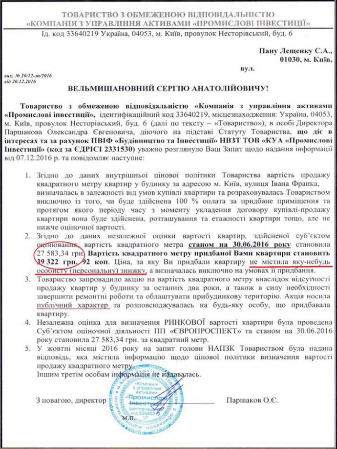 В то же время согласно комментарию адвоката Сергея Лещенко Дмитрия Гненного в его ФБ, компания, у которой депутат покупал квартиру, не предоставляла никаких персональных скидок.