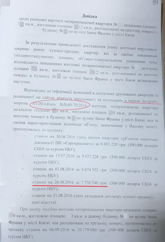 Автор справки указывает, что на 31.08.2016 года данных о стоимости квартиры НЕТ. При этом дальше эксперт отмечает, что, по его мнению, стоимость квартиры по состоянию на 31.08.2016 года МОГЛА составлять 9351648 грн.