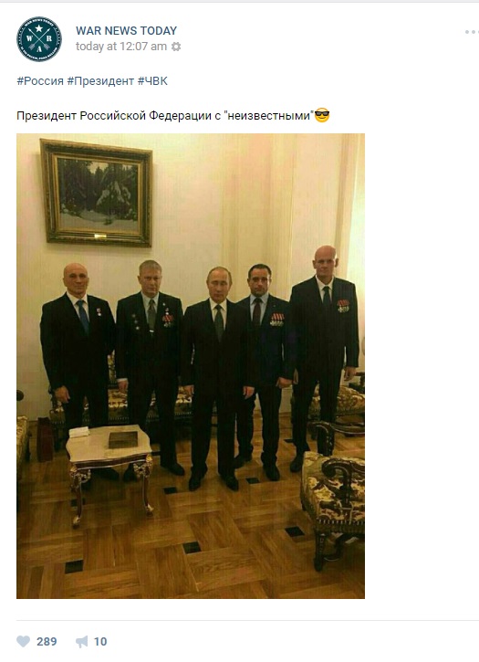 Фотография, на которой Владимир Путин позирует вместе с Дмитрием Уткиным, которого также называют командиром частной военной компании "ЧВК Вагнера" и его заместителем Андреем Трошевым, появилась в группе во "ВКонтакте" WAR NEWS TODAY.