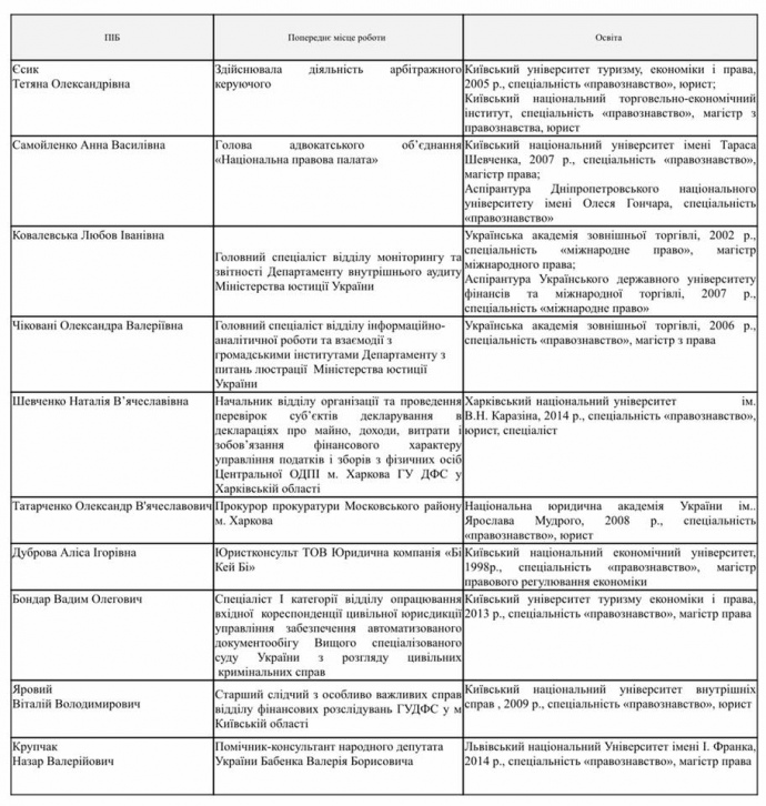 Как следует из предоставленной информации, двое из них работают в Минюсте, двое в Государственной фискальной службе, четверо являются частными юристами, один - прокурором и еще один - работником суда.