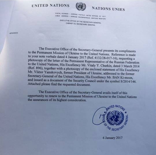 "Главная военная прокуратура получила от Постоянного представительства Украины официальное письмо секретариата ООН с предоставлением украинской стороне заверенной официальной печатью ООН фотокопии заявления Януковича от 01.03.2014 с просьбой ввести войска Российской Федерации в Украину и все официальные материалы, которые были добавлены от РФ к заявлению представителя РФ в ООН Чуркина ", - сообщил Луценко.