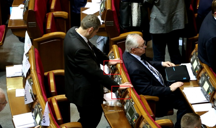 На видео, опубликованном активистами, видно, что во время голосования депутат Мосийчук, кроме своего места, нажимает кнопку и на месте отсутствующего Андрея Билецкого.