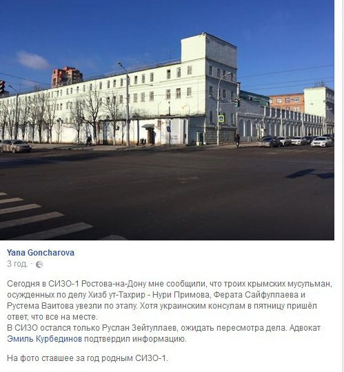 "Сегодня в СИЗО-1 Ростова-на-Дону мне сообщили, что троих крымских мусульман, осужденных по делу Хизб ут-Тахрир - Нури Примова, Ферата Сайфуллаева и Рустема Ваитова увезли по этапу. Хотя украинским консулам в пятницу пришёл ответ, что все на месте", – пишет Гончарова.
