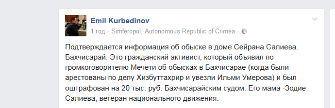 Глава ЦИК Курултая крымскотатарского народа Заир Смедляев пишет, что во время обыска изъяли мобильные телефоны, а самого Салиева увезли в участок полиции.