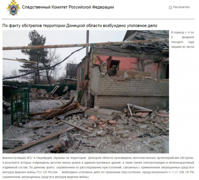 По версии российских следователей в период с 4 по 6 февраля военные ВСУ и Нацгвардии Украины на территории Донецкой области провели "многочисленные артиллерийские обстрелы, в результате которых повреждены десятки жилых домов и административных зданий, а также линии электропередач и железнодорожный подвижной состав".