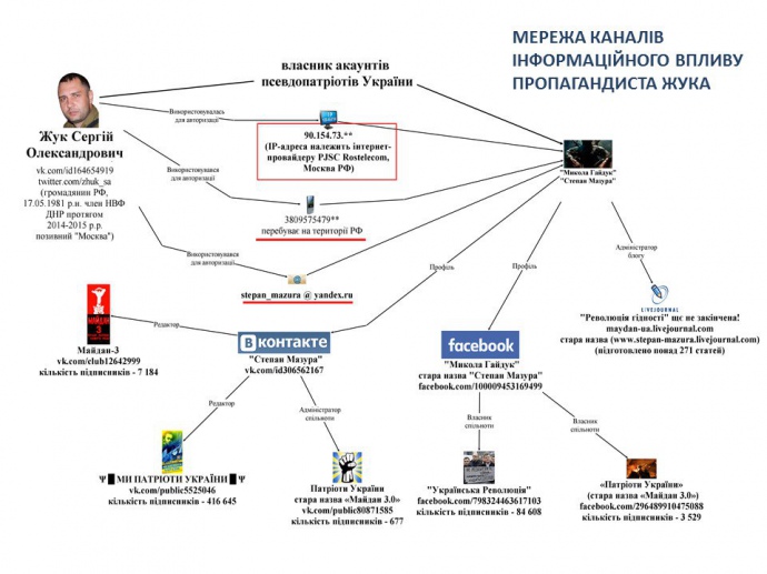Жук причастен к созданию и администрированию сообществ в социальных сетях "Патриоты Украины", "Украинская революция", "Продолжение Революции Достоинства", "Все на Майдан", которые распространяют призывы к массовым беспорядкам.
