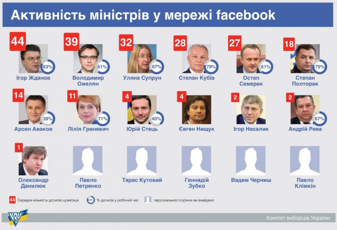 Среди членов правительства, которые активно пользовались Facebook на работе, называют - министра молодежи и спорта Игоря Жданова (83% публикаций), министра экономического развития Степана Кубива (79%), министра обороны Степана Полторака (79%), министра инфраструктуры Владимира Омеляна (61%) и министра экологии Остапа Семерака (61%).