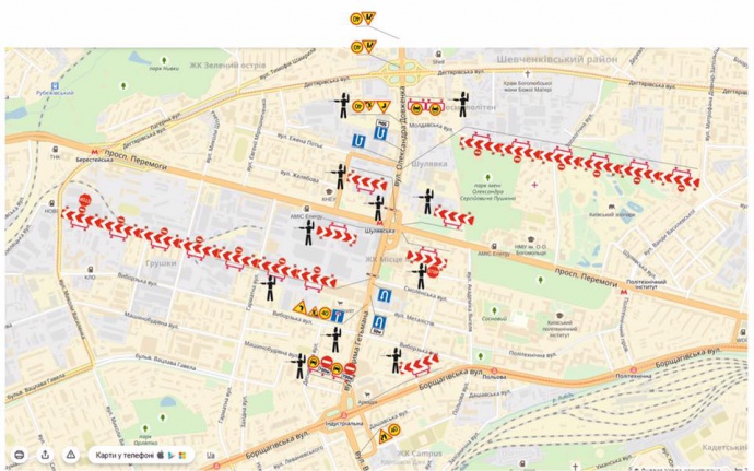 "К примеру, водители, которые пользуются ул. Довженко предлагаем изменить маршрут и ехать по ул. Дегтяревской. Машинам, следующим по ул. В. Гетьмана предлагаем двигаться по улице Борщаговская. Кто планировал ехать ул. Довженко и В. Гетьмана просьба воздержаться от этого маршрута. Ниже схема маршрутов объезда от КП "Киевдорсервис", - добавили в КГГА.