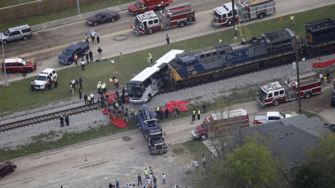 Как сообщил на брифинге представитель местной полиции, автобус, следовавший из Техаса, по пока невыясненной причине застрял на путях. В автобусе находились примерно 50 пассажиров - преимущественно пожилые люди.