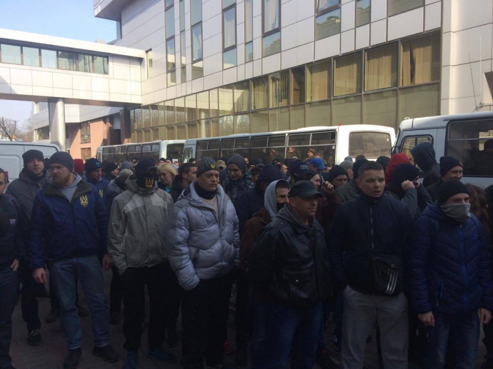 Под Апелляционным судом Киева, где начинается рассмотрение апелляционной жалобы об аресте председателя ДФС Романа Насирова, собралось более сотни молодых людей с нашивками "Национальный корпус".