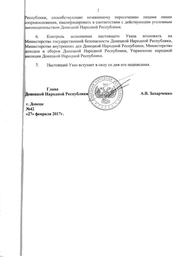 "Установить для линии соприкосновения, проходящей между "Донецкой народной республикой" и Украиной, статус государственной границы", - сказано в указе.