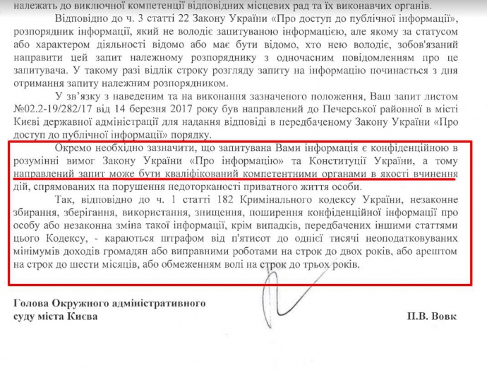 Так в ответе судьи в частности сказано "... запрашиваемая вами информация является конфиденциальной в понимании требований закона "Об информации" и Конституции Украины, а потому направленный запрос может быть квалифицирован компетентными органами в качестве совершение действий, направленных на нарушение неприкосновенности частной жизни лица".