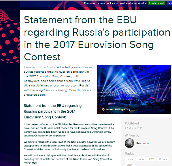 Европейский вещательный союз, который является организатором песенного конкурса Евровидение, разочарован решением Украины запретить въезд представительнице России Юлии Самойловой.