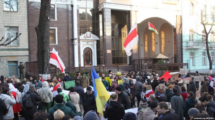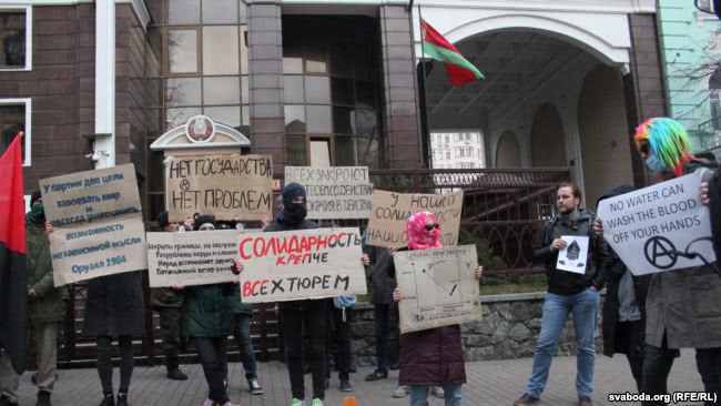 В Киеве возле посольства Беларуси провели акцию солидарности с задержанными в День Воли в Минске.