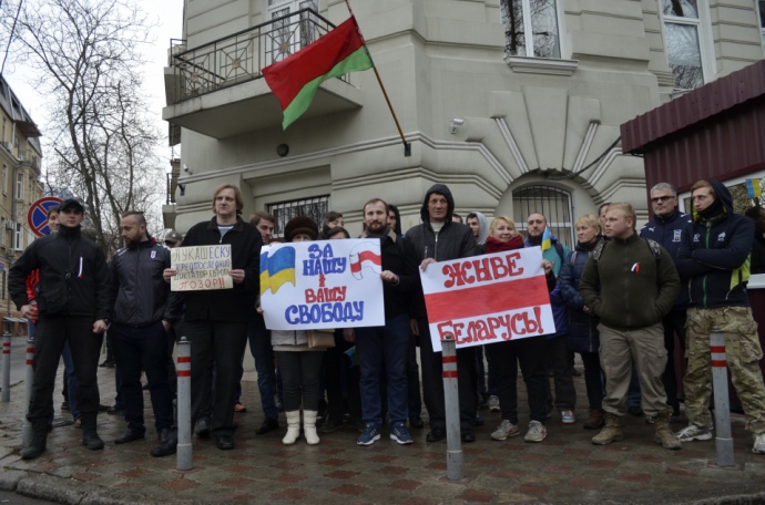 В частности, как сообщает Укринформ, в акции под консульством Беларуси в Одессе в поддержку участников Дня Воли в Минске собралось около трех десятков одесских общественных активистов с плакатами. В 18:00, развернув плакаты, активисты стали под окнами консульства, перекрыв центральный вход, который охранялся нарядами полиции и Нацгвардии.