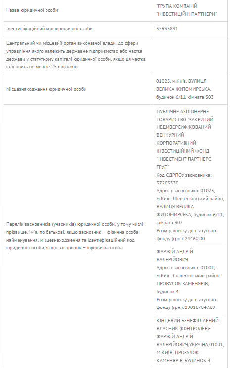 Кроме того, Журжий является конечным бенефициаром 20 компаний, которые расположены по одному адресу в Киеве: ул. Большая Житомирская 6/11. Этот же адрес у ООО "Группа компаний "Инвестиционные партнеры", которая была отчуждена в 2016 году.