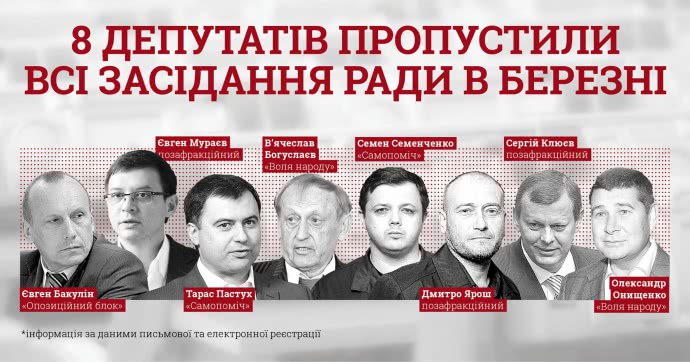 По данным письменной и электронной регистрации 8 народных депутатов пропустили все пленарные заседания Верховной Рады в марте.