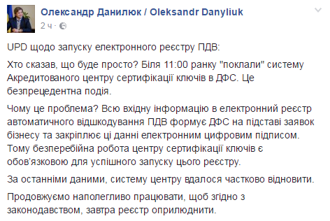 1 апреля Александр Данилюк в своем Facebook заявил: "Общими усилиями Минфина, Казначейства и ГФС уже достигли результатов - реестр запущен, проходит его наполнение информацией".