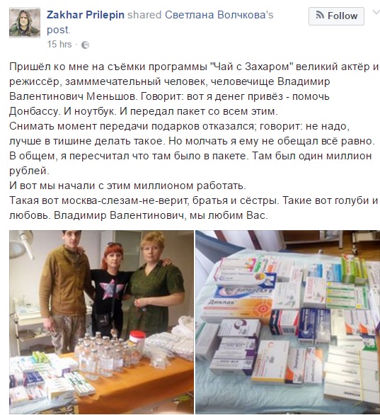 Российский режиссер и актер Владимир Меньшов передал гражданину РФ, воюющему на стороне боевиков, писателю Захару (Евгению) Прилепину миллион.