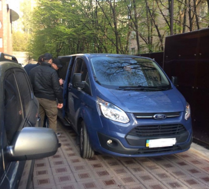 Мартыненко вместе с детективами вышли через боковой выход здания на Кловском спуске, 7, сели в синий микроавтобус НАБУ и уехали.