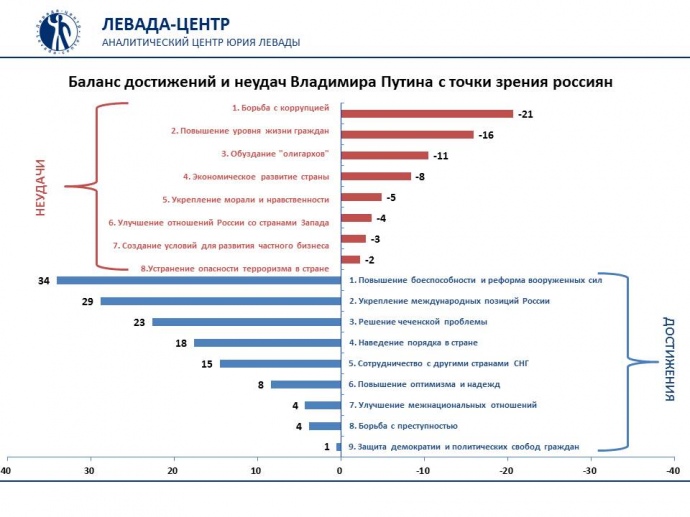 Главными неудачами главы РФ за годы его правления россияне назвали борьбу с коррупцией и взяточничеством, повышение уровня жизни граждан, рост зарплат и пенсий и экономическое развитие страны. Среди достижений Путина было названо повышение боеспособности и реформа вооруженных сил, укрепление международных позиций России и решение чеченской проблемы.