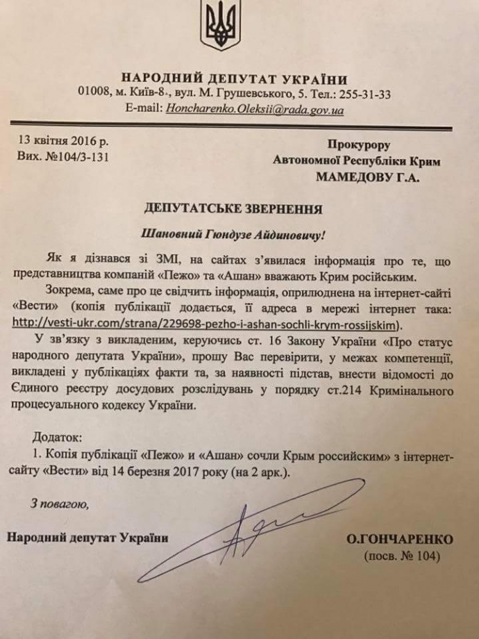 По ее данным, дело возбуждено по обращению депутата Верховной Рады. Он просит проверить факты, "изложенные в одном из интернет-изданий", о представительствах французских компаний на территории полуострова.