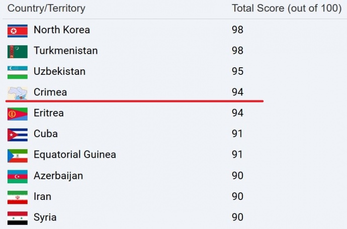 Полуостров внесли в десятку "худших" из 66 стран и территорий, отмеченных как регионы, где нет свободной прессы. Меньше свободы только в СМИ Северной Кореи, Туркменистана и Узбекистана. Уровень Крыма уже третий год подряд оценивается в 94 балла из 100 возможных, где сто – это максимум несвободы.
