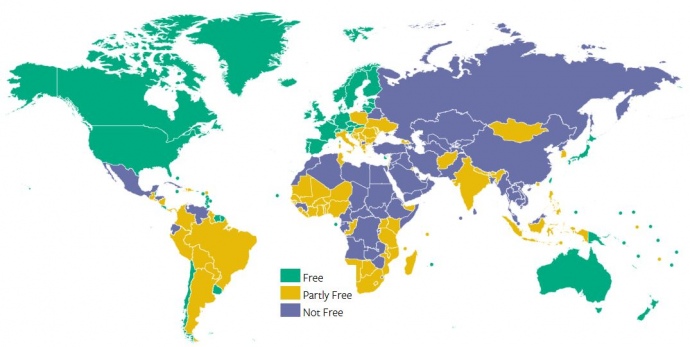 Значение цветов: зеленый – свободная пресса, желтый – частично свободная пресса, фиолетовый – несвободная пресса