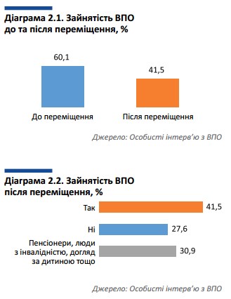 Указывается, что только 41,5% ВПЛ, по сравнению с 60,1% до перемещения, удалось найти работу в новом месте.