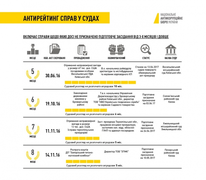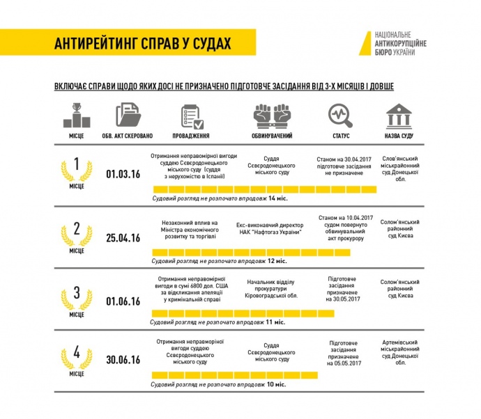 Среди прочих в суде 12 месяцев находится дело о незаконном влияние на министра экономического развития и торговли, в которой обвиняют экс-исполнительного директора НАК "Нафтогаз", в течение 11 месяцев - дело о получении неправомерной выгоды начальницей отдела прокуратуры Кировоградской области.