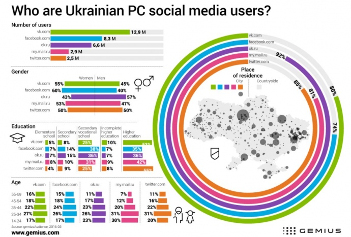 Так, ежеквартальные исследования онлайнового поведения Интернет ассоциации Украины показывают, что "Вконтакте" и "Одноклассники" являются более популярными социальными сетями, чем Facebook и Twitter среди украинских интернет-пользователей.