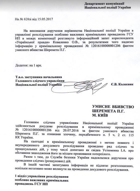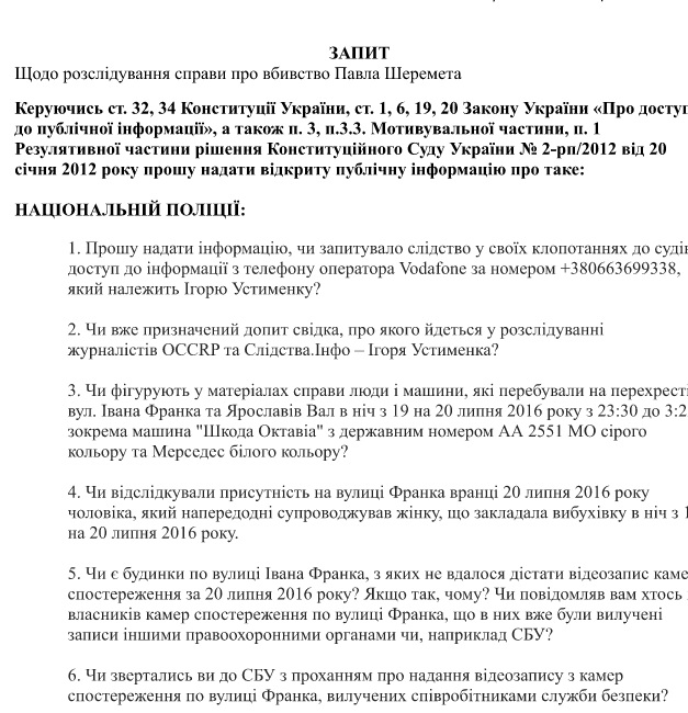 Запрос посылался 15 мая, до того, как стало известно о вызове на допрос бывшего сотрудника СБУ Игоря Устименко. Ответ получен 22 мая. В нем с 6 вопросов, Нацполиция сообщила лишь, что Устименко допрошен.