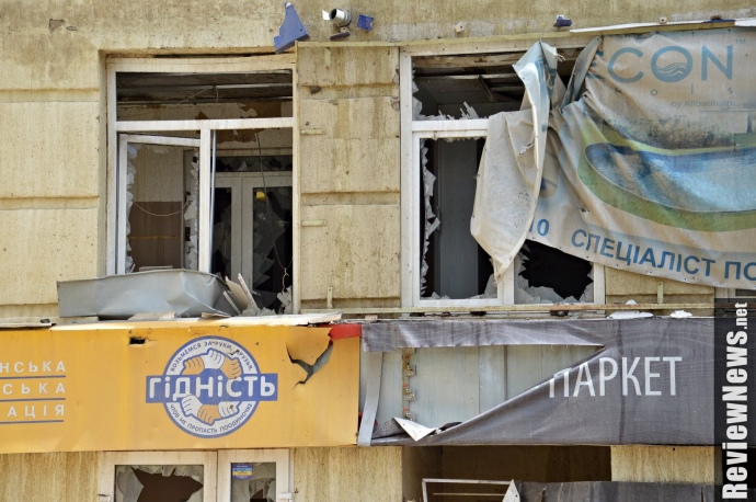 Повреждены 4 автомобиля и окна здания перед промоиной.