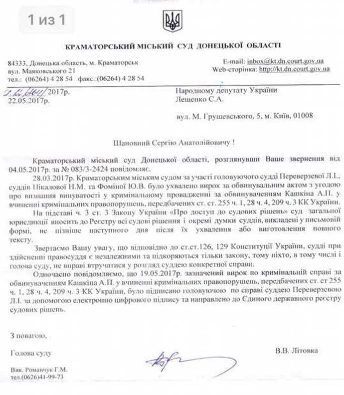 Как известно, 28 марта 2017 года Краматорский горсуд с участием судей Переверзевой, Пикаловой и Фоминой вынес приговор по обвинению Кашкина, которого называют номинальным владельцем одной из фирм человека из окружения экс-президента Виктора Януковича Сергея Курченко.