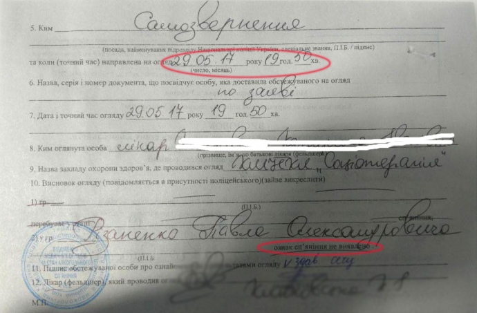 Ризаненко также передал еще одну справку, сделанную на следующий день по "самообращению". В ней отмечается, что на 19:50 29 мая этого года признаков опьянения не выявлено.